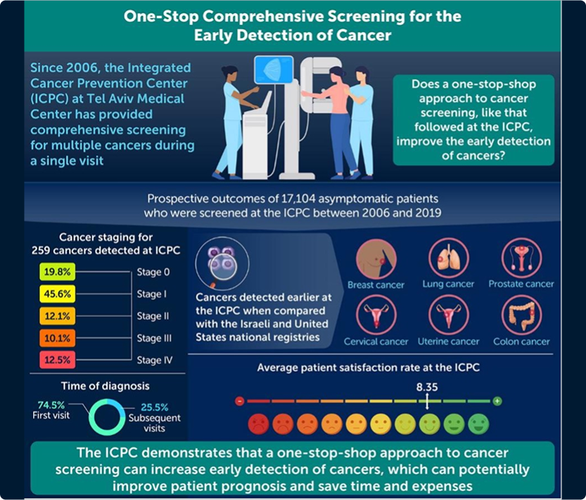 This prospective study investigated whether a one-stop-shop screening center can lead to an increase in early-stage detection of cancers. 17,104 healthy asymptomatic adults at the integrated cancer underwent the entire spectrum of recommended cancer screening tests. Surveys elicited an excellent patient satisfaction rate. The great majority of cancers were detected at an early stage. When compared with the Israeli general public, the percentage of cancers found at a metastatic stage at the integrated cancer prevention center were lower for breast, lung, colon, prostate, and cervical/uterine cancers. An integrative multicancer screening program may serve as an efficient and valuable approach in identifying early-stage cancers.